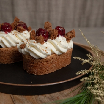 Heerlijk, vers gemaakt in onze eigen Schenkerij: een monchou gebakje, met als bodem een slofje met amandelspijs, daarop kersen, banketbakkersroom, monchouslagroom en bastogne kruimel.