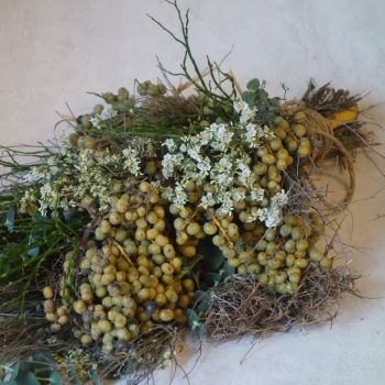 Een leuke toef met dadeltak, bosbes, statice, tijm en eucaluptus