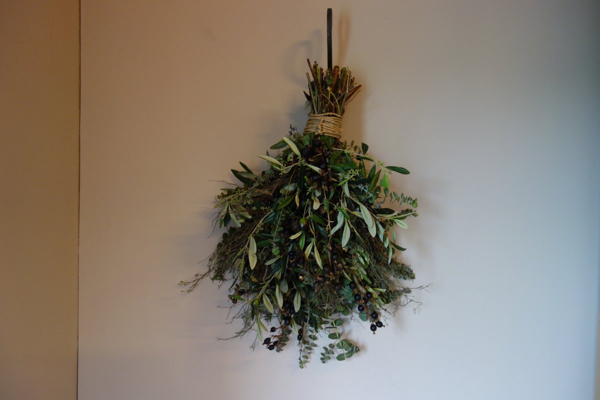 Deze toef is ongeveer 50cm. lang en hierin zit wilde thijm, olijfgroen en zwarte bes en statice verwerkt.